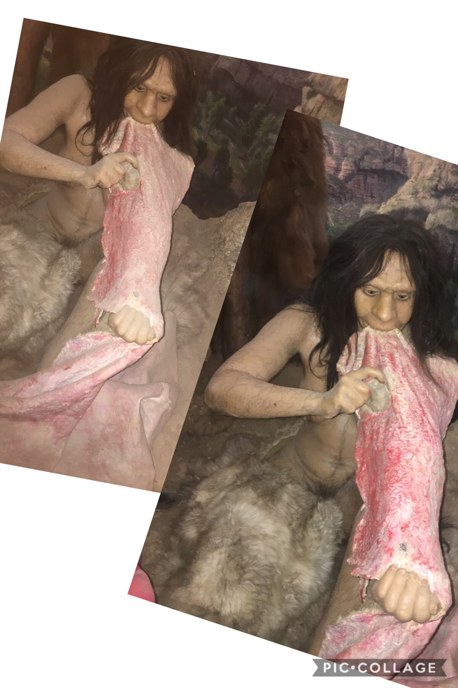 In the Homo neanderthalensis diorama, one million years later (WTF), we had to dust off the animal flesh they had hunted and prepared, from gray to appetizing. It worked, I think. See for yourself:
