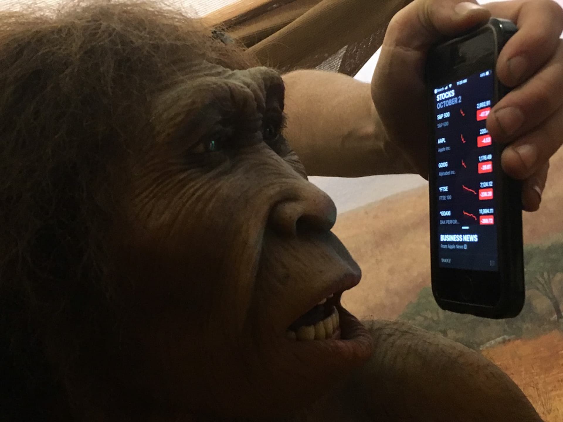 My first job at a natural history museum was dusting the four life-size tableaux in the Hall of Human Origins. We went chronologically, starting with the Stone Age (Homo ergaster) and ending with the present (Homo sapiens). Everything is extremely delicate. Early man is covered in hair, and several flies sit upon his skin. We had to vacuum the dust off and all around him, leaving every leaf, every hair, intact. Once he was dust-free, we showed him the stock market. It was all red, and you can imagine, he was shocked.